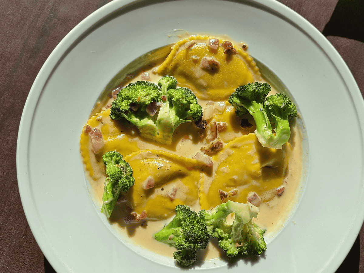 Braised pumpkin tucked into tender ravioli with sautéed florets of broccoli, red onions, and smokey bacon in a creamy pumpkin liquor sauce, finished with fresh Italian parsley